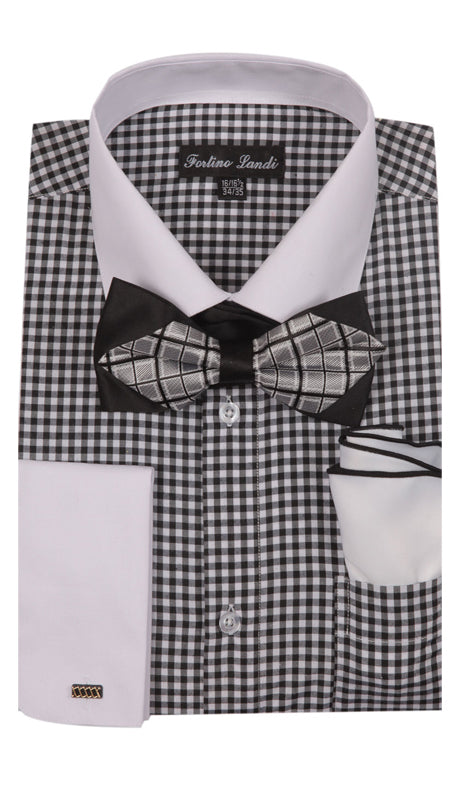 Introducing the FL628-BK dress shirt, a perfect blend of elegance and style. This shirt comes with a matching bow tie, cuff links, and a handkerchief, making it an excellent choice for formal occasions or a night out on the town. The sleek black and white gingham pattern adds a timeless charm that is sure to turn heads.