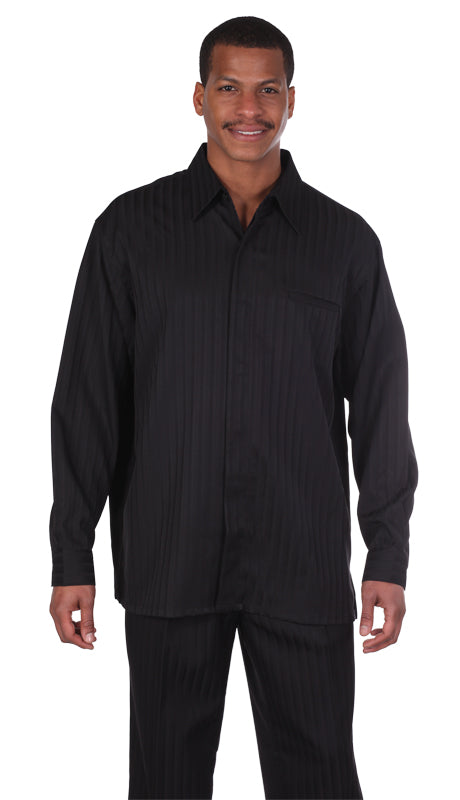 The Mens Walking Suit 2752-BLK is a perfect blend of style and comfort, designed for those who appreciate elegance in their casual wear. This 2-piece suit features a modern shadow stripe pattern, which adds a touch of sophistication while maintaining a relaxed vibe. The long sleeve shirt comes equipped with a convenient breast pocket, making it not only stylish but also practical for storing small essentials.